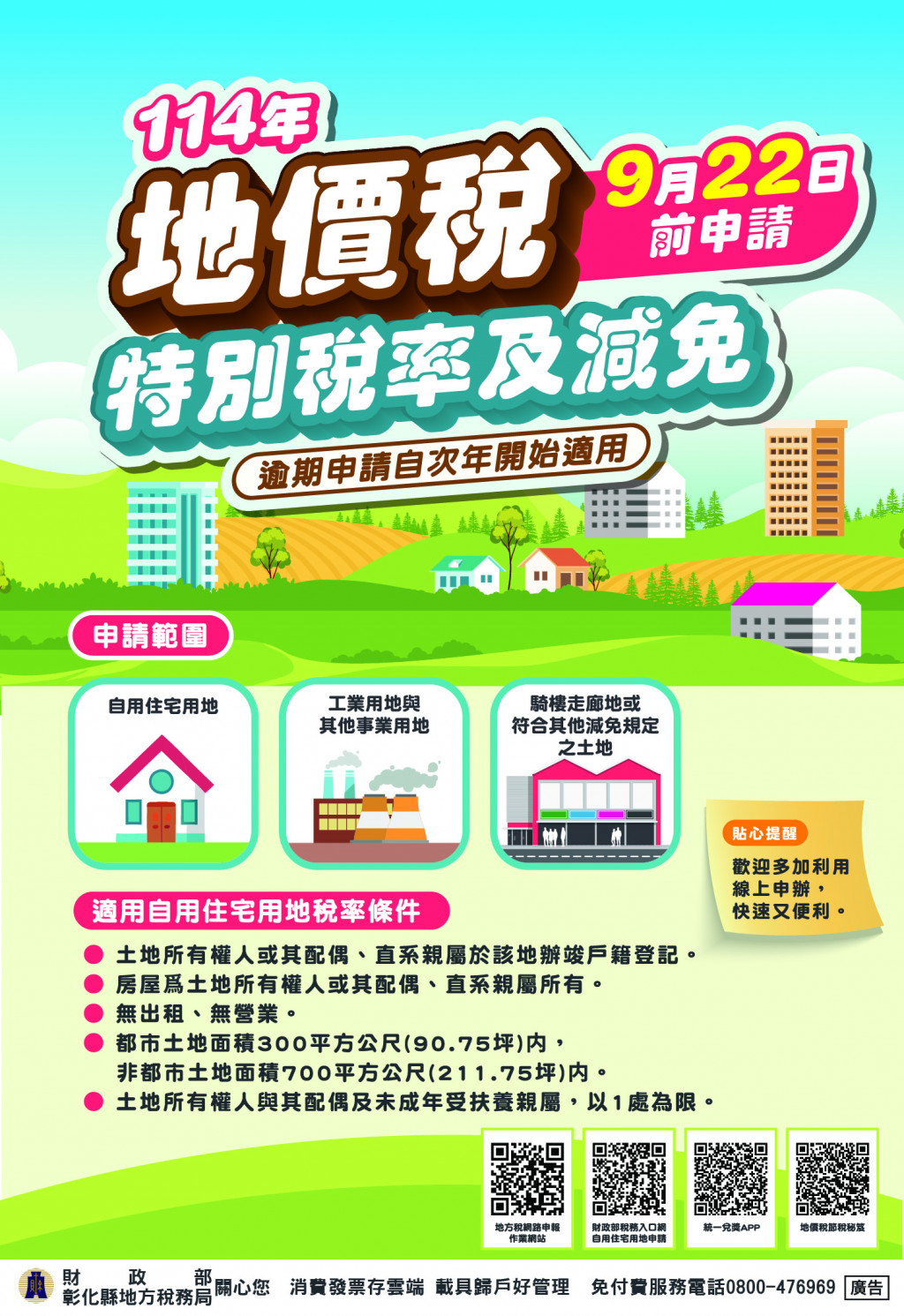 114年適用地價稅特別稅率及減免,請於9月22日前提出申請當期即適用,逾期申請自次年開始適用,彰化縣地方稅務局關心您!