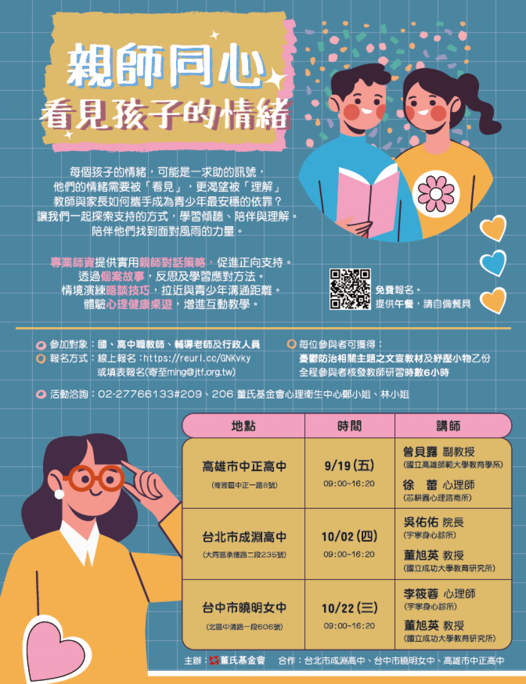 財團法人董氏基金會將於北、中、南部辦理114年度教師培訓課程,中部場次與臺中市曉明女中合作辦理,期提升教師對青少年憂鬱的認知,增進教師與家長、青少年的溝通技巧,以及面對壓力及憂鬱的處遇方式,陪伴青少年走出情緒風暴。