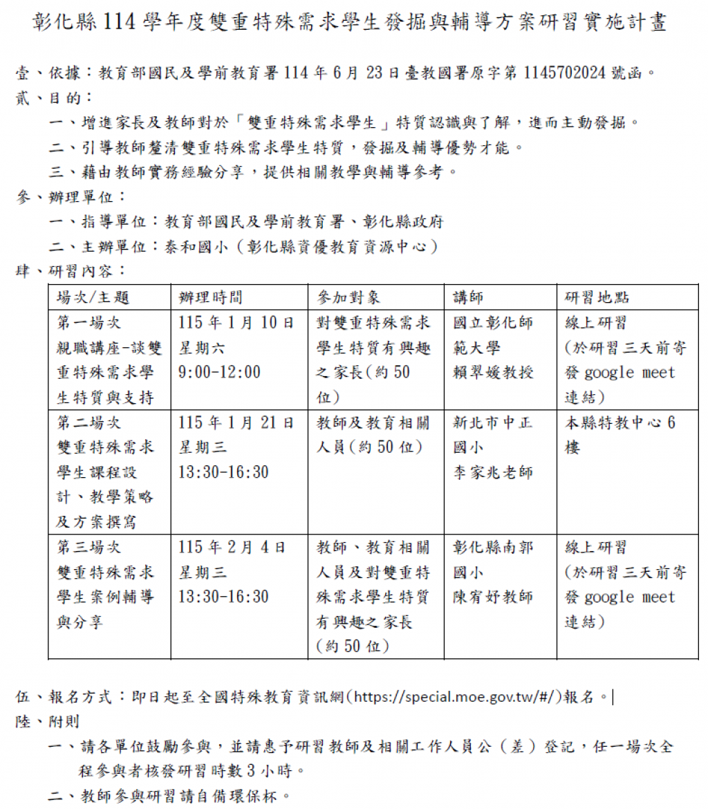 報名方式 即日起至全國特殊教育資訊網 https://special.moe.gov. 報名。